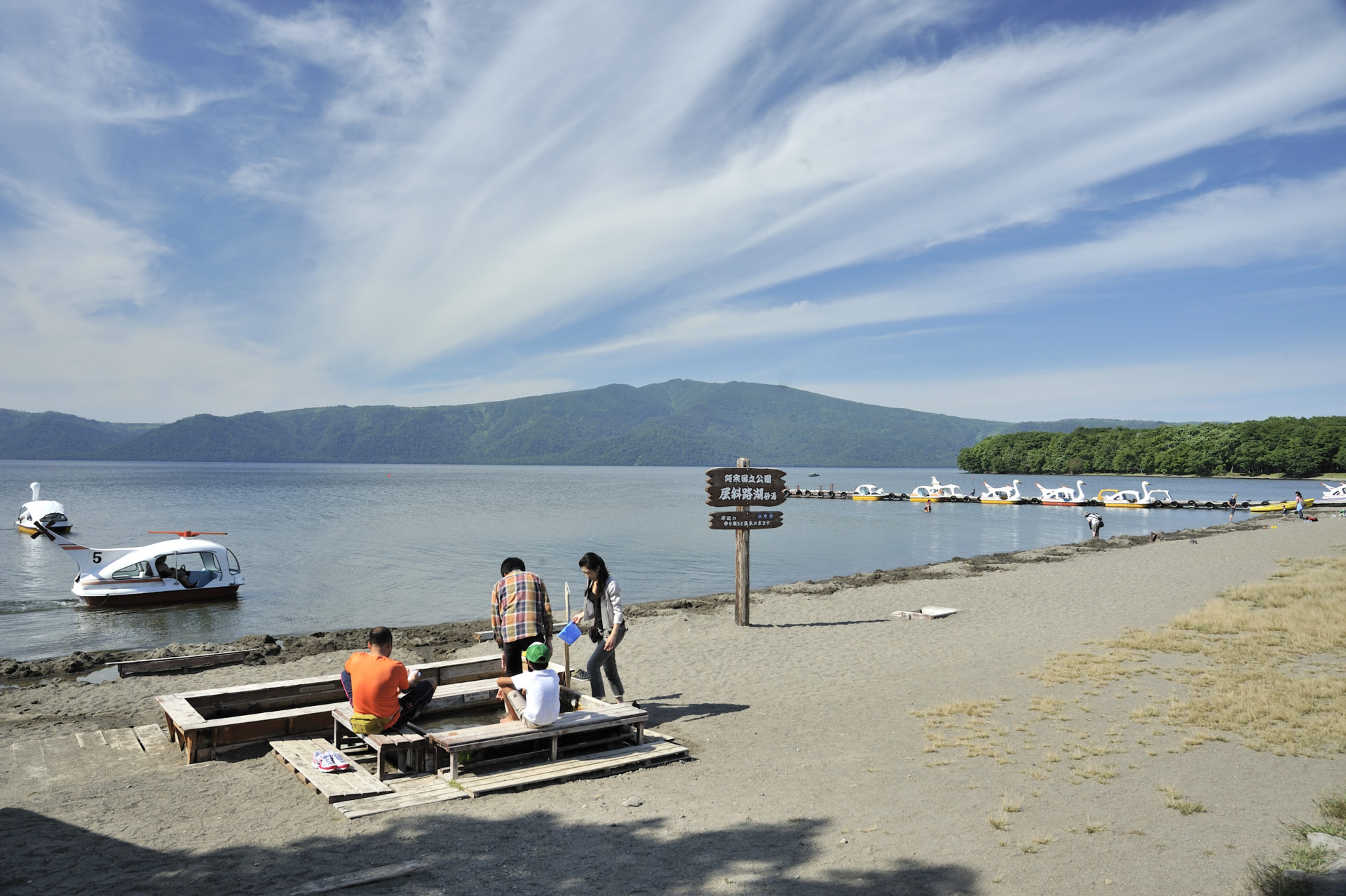 在湖泊的各處砂岸,當湖水隨著波漾靠近岸邊時,此時只要把岸上的砂子挖空,溫泉便會不可思議地自然湧了出來。大概挖上10到30公分左右,便可以享受簡單的足湯,這便是此處砂湯的魅力。大多數來訪的人都在自己喜歡的地方,創造出一個只屬於自己的露天溫泉,悠悠哉哉地享受著這裡的溫泉魅力。